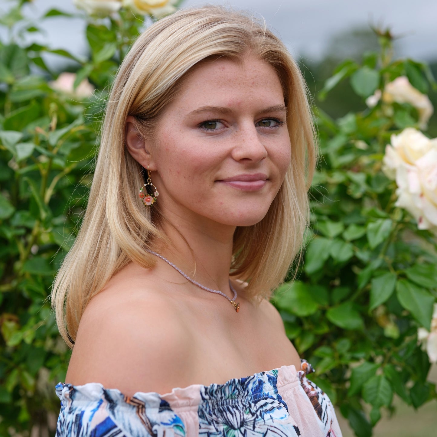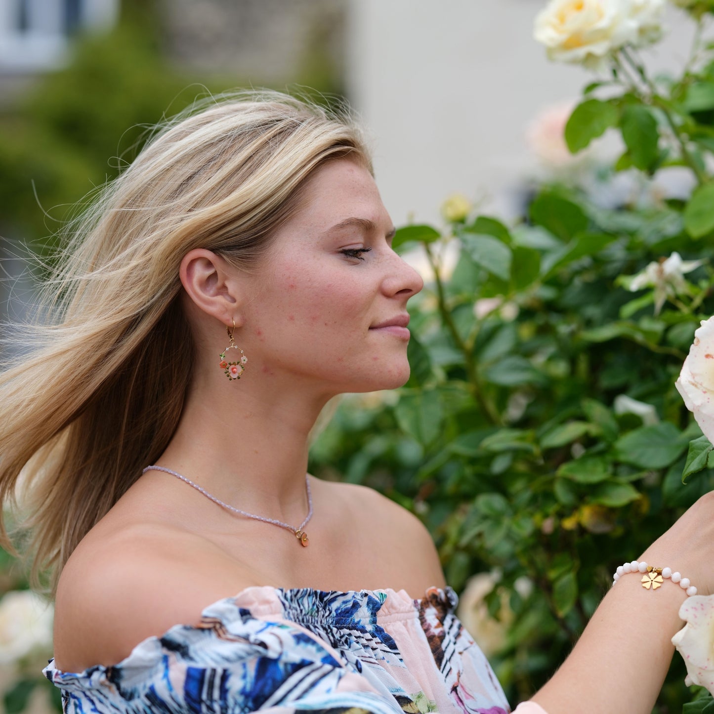 Delicate wreaths with hand painted enamelled flowers, leaves and tiny diamante on a plated, beaten gold closed clasp strike the right balance between everyday charm and special occasion elegance. Available in refreshing peach.